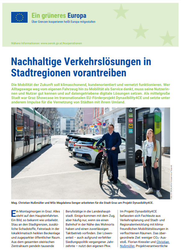 Die Mobilität der Zukunft soll klimaschonend, kundenorientiert und vernetzt funktionieren. Wer Alltagswege weg vom eigenen Fahrzeug hin zu Mobilität als Service denkt, muss seine Nutzer:innen gut kennen und auf datengetriebene digitale Lösungen setzen. Als mittelgroße Stadt war Graz Showcase im transnationalen EU-Förderprojekt Dynaxibility4CE und setzte unter anderem Impulse für die Vernetzung von Städten mit ihrem Umland.